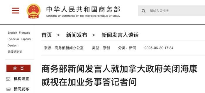 商务部新闻发言人就加拿大政府关闭海康威视在加业务事答记者问